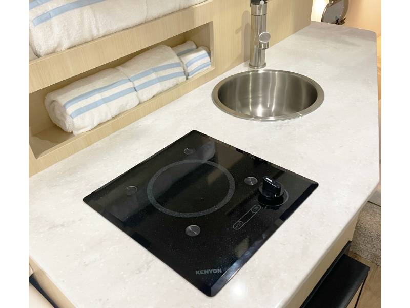 The most recognizable line of radiant electric cooktops offered by Kenyon is the Mediterranean series. A single 6.5″ burner on the Mediterranean 1 Burner cooktop makes it the ideal complement to any small galley. This cooktop will look as nice as it cooks thanks to the distinctive black speckled glass and beveled edge.