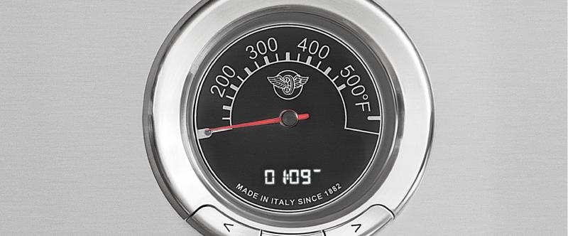 Bertazzoni engineers have worked to design a highly efficient worktop by reducing the flame-to-cookware distance for faster heating. More lateral space has been created between the burners so you can use larger cookware more effectively. This digital thermostat and user interface make cooking a large variety of dishes at exactly the right temperature simple. It constantly monitors the temperature at the heart of the dish and adjusts the oven temperature automatically for even cooking and perfect results every time.