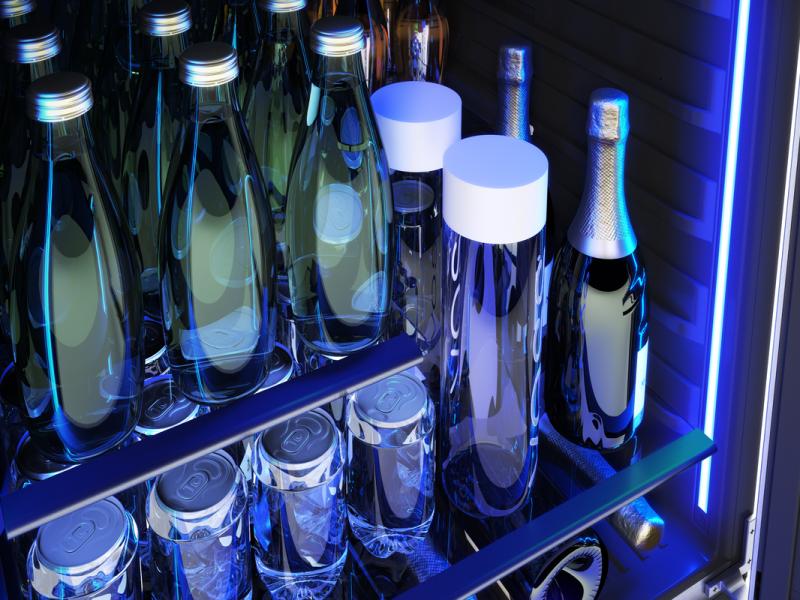 Our Presrv Beverage Cooler in black stainless steel is as chill as it looks and is always ready to party. A sleek alternative to stainless steel, this cooler features a Full-Extension Wood Rack to hold your favorite wine and craft brew and a convenient retractable glass quarter-shelf that gives you the flexibility to display taller bottles such as water, 2-liter bottles of soda, or champagne. New enhancements include mood-setting LED light strips in three colors and four light levels and an updated kickplate with lock.