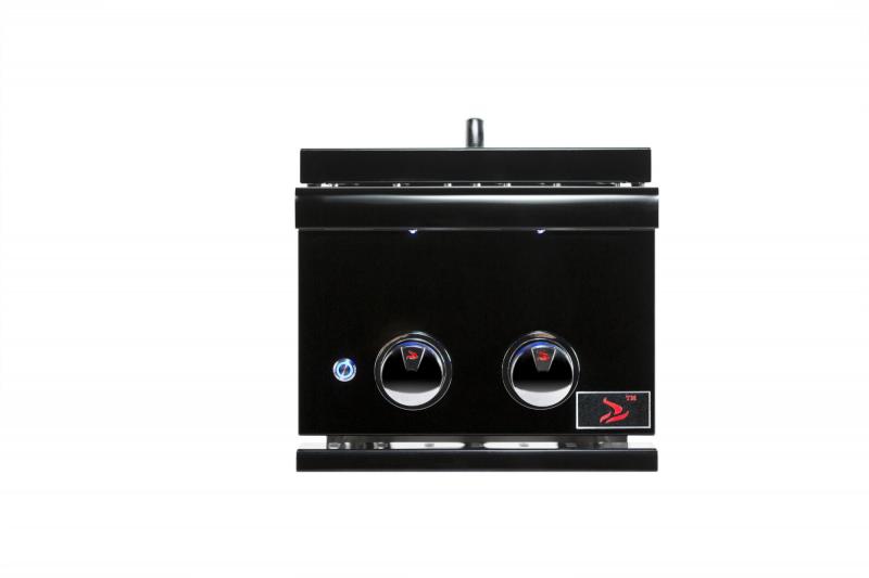 This outdoor kitchen side burner is equipped with a heavy duty 304 stainless steel grate, 2 cast brass burners (total 24,000 BTUs), blue LED control panel lights, a stainless steel removable lid and a conversion kit