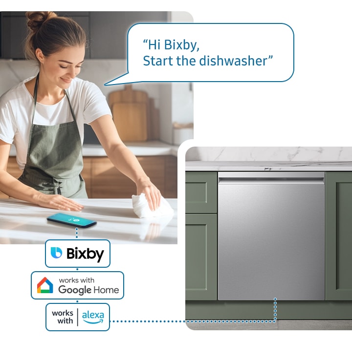 Control the dishwasher really easily with just your voice. Using Samsung Bixby*, you can simply say what you want it to do and it will do it. So you can select cycle options, control settings and monitor its progress. And, if you cannot read the screen, it can provide spoken feedback.