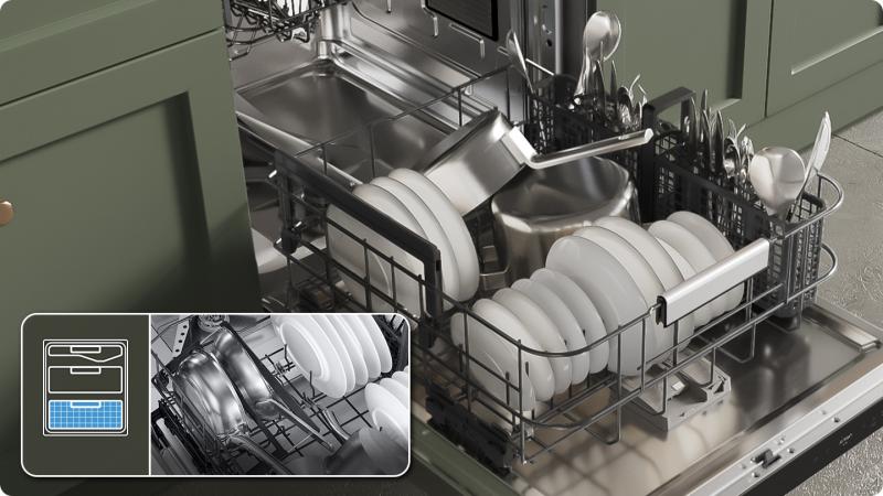 Clean heavily soiled pots, pans and dishes. StormWash+™ delivers an intensive washing performance. A circle-shaped spray jet covers a larger area* and blasts water from many angles**. A new Pan holder enhances the power of the washing jet. And two washing arms help wash quickly and effectively.