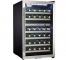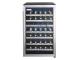 This free-standing contemporary wine cooler serves up 4 cubic feet of cooling space making it ideal for storing up to 38 bottles of your most beloved wines. The stainless steel-trimmed black wood shelves make it a stunning unit as they match the attractive stainless-steel exterior. This top-of-the-line cooler features two separate storage areas which are independently controlled temperature-wise by a white LED digital thermostat. This enables you to chill white and rose wines in one compartment and red wines in another as the programmable temperature range lies between 5°C and 18°C (41°F and 64°F). You can quickly program and monitor the temperatures with the push of a button while the thermostat's display unit can easily be viewed through the tempered-glass door, which also keeps out harmful ultraviolet rays. The cooler features an atmospheric white-interior LED track-lighting system which shuns the need of a warm incandescent bulb and unwanted heat and impressively showcases your wine collection. In addition, the stainless-steel towel bar door handle adds an elegant touch and the clever reversible door swing allows you to adjust it for either left or right-hand opening. The 18-month parts and labour warranty with in-home service makes this model even more desirable and economical.
