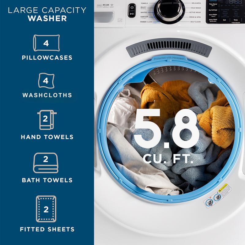Power through laundry day in less time with an extra large capacity washer that fits more in every load. The 5.8 cu ft IEC capacity can easily accommodate bulky items or large loads.