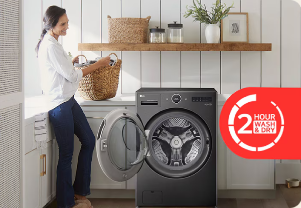 *Based on independent testing in Wash+Dry cycle with Dryer on Energy Saver mode, 10 lb. DOE standard load (October 2023). Cycle time may vary depending on load type/weight. ** Up to 60% less energy compared to similarly-sized vented LG electric dryers. The industry's most energy efficient combo based on http://EnergyStar.gov (November 2023).