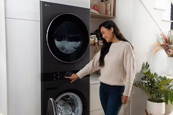 The sleek single unit LG WashTower™ has full-size 5.8.cu washer and 7.8 cu. ft dryer capacity in half the floor space*. Unlike conventional stacked pairs, LG’s exclusive Centre Control™ panel is perfectly positioned with both washer and dryer controls at just the right height.