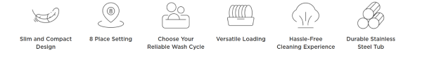 - With room for up to 8 place settings, this dishwasher makes loading and unloading quick and easy, perfect for smaller households or entertaining.
