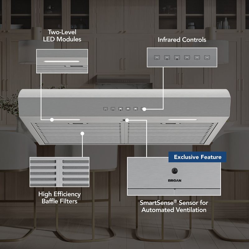 - SmartSense™ Automated Ventilation: Expel pollutants from your home without thought or action; An infrared sensor monitors for heat coming off the range and will automatically adjust the hood's fan speed as needed to eliminate smoke and odors while cooking