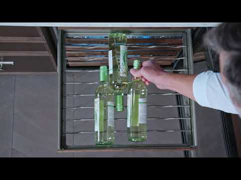 Holds up to 57 bottles positioned either horizontally or vertically to maximize space and can be removed for larger bottles.