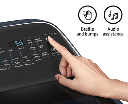Aiding the visually and hearing impaired, your washer and dryer now features audio assistance, playing a different sound for each option, and braille right next to key control panel buttons.
