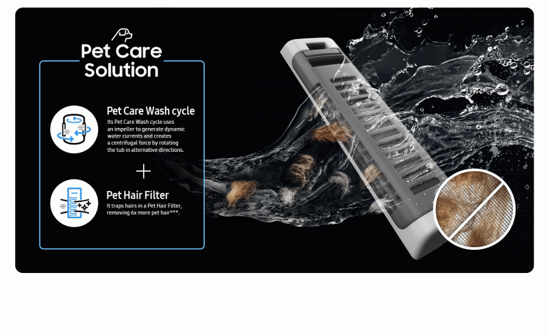 - Remove 6x times more pet hair* with Pet Care cycle and dual pet hair filters.
