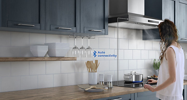 Automatically syncs the fan and the lights with the burners through Bluetooth. Auto Connectivity* aligns the hood and cooktop's status so you can control the hood using the one-touch control of the cooktop, instantly turning them both ‘On' or ‘Off', for the ultimate in cooking convenience.