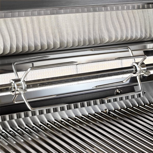 - Impeccable precision-with a dual-position rotisserie internally powered by a heavy-duty three-speed motor, and a rear infrared burner delivering up to 14,000 BTU