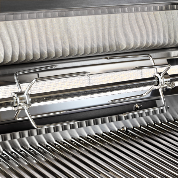 - Slow-cooking excellence—a dual-position rotisserie internally powered by a heavy-duty three-speed motor, and a rear infrared burner delivering up to 14,000 BTU