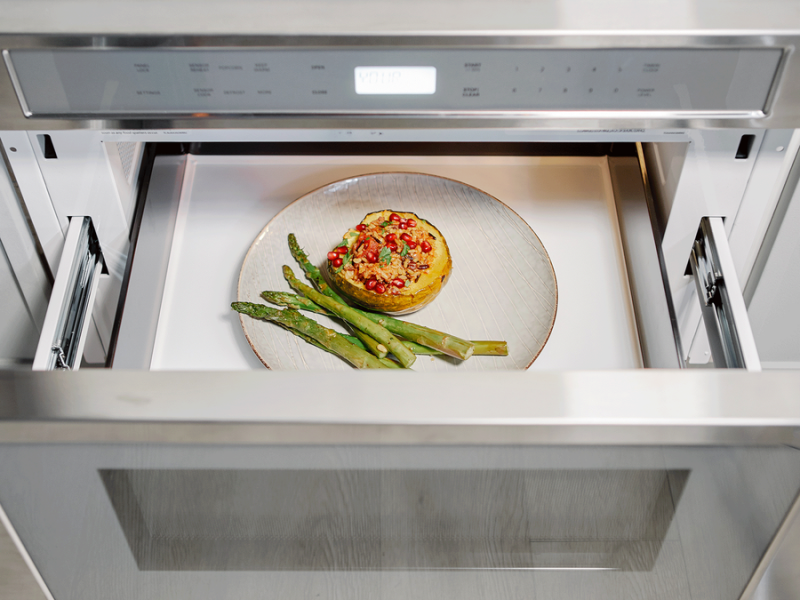 Incorporating a sleek, uncluttered design, the Built-In MicroDrawer® Microwave opens and closes with a simple touch, eliminating the need for a handle.