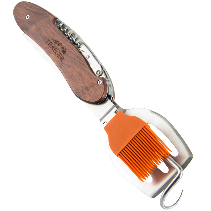- Includes portable-sized spatula, pig tail, basting brush, and corkscrew