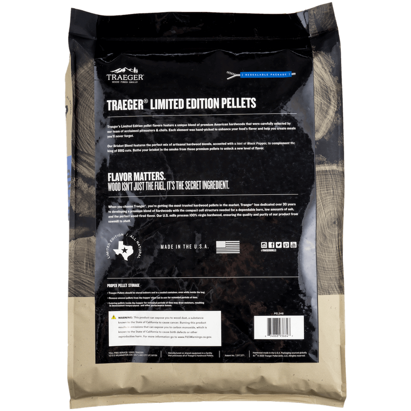 Our limited-edition pellet flavors feature artisanal blends of premium American hardwoods that were carefully selected by our team of acclaimed pitmasters & chefs. Each element was hand-picked to enhance your food’s flavor and help you create meals you’ll never forget. Our Brisket Blend features the perfect mix of hardwoods featuring Oak and Pecan, accented with a hint of Black Pepper, to complement the king of BBQ cuts.