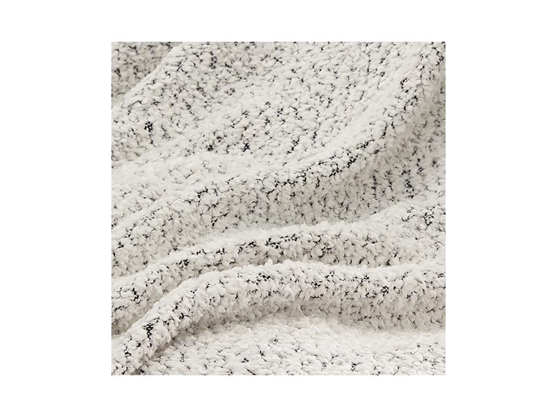 Hand woven boucle in black and white. Brush fringe in black. Acrylic/polyester/chenille blend. Spot clean only.