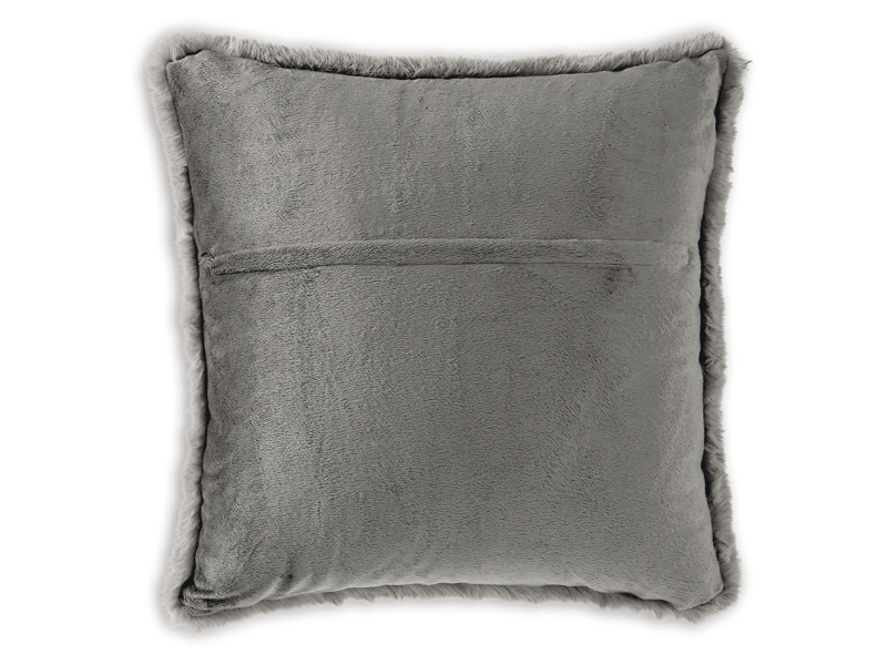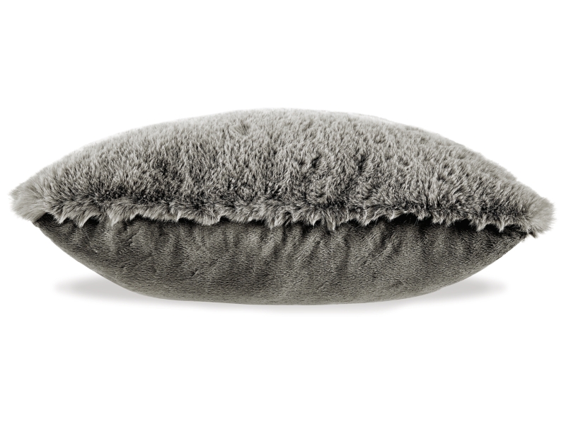Faux rabbit fur in dark gray. Solid reverse in dark gray. Polyester cover. Zipper closure. Fiber filled. Dry clean only.