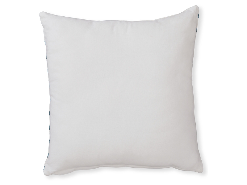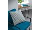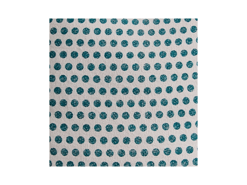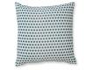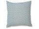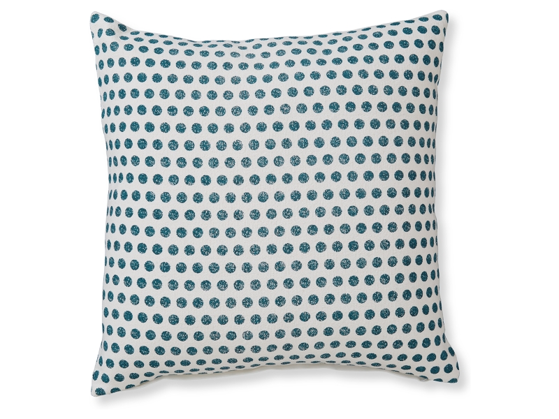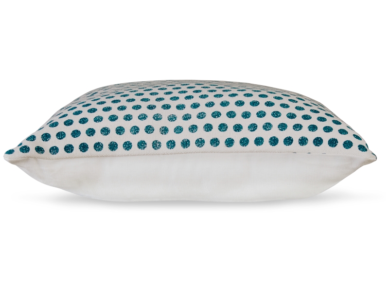 Block printed dot design in teal and white. Solid reverse in white. Knife edge construction. Cotton cover. Zipper closure. Fiber filled. Machine washable cover.