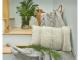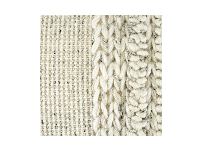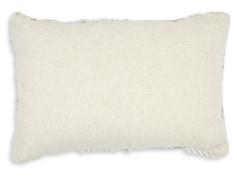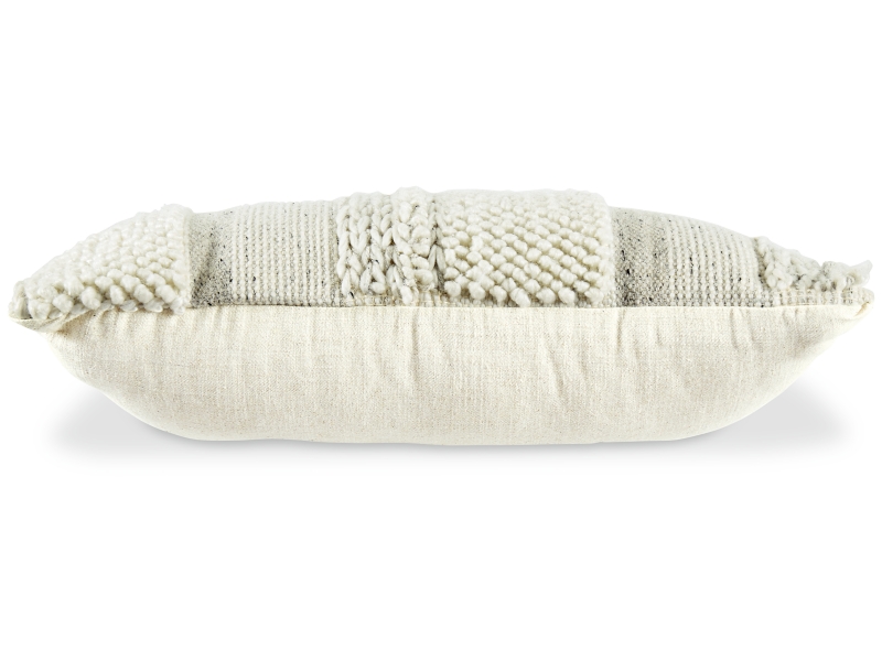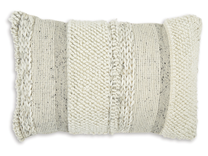 Hand woven stripe design in white and gray. Solid reverse in cream. Knife edge construction. Polyester/cotton/wool blend face with cotton reverse. Zipper closure. Fiber filled. Spot clean only.