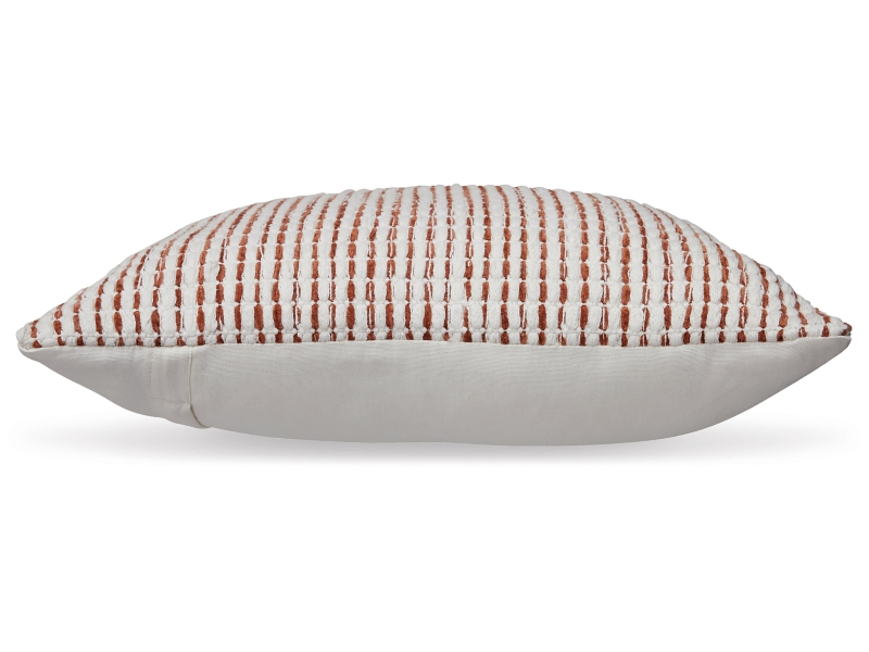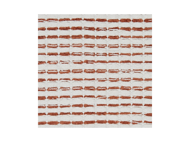 Woven stripe design in rust and white. Solid reverse in white. Knife edge construction. Cotton face with polyester reverse. Zipper closure. Fiber filled. Spot clean only.