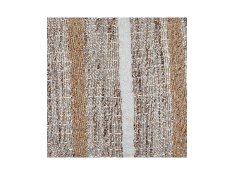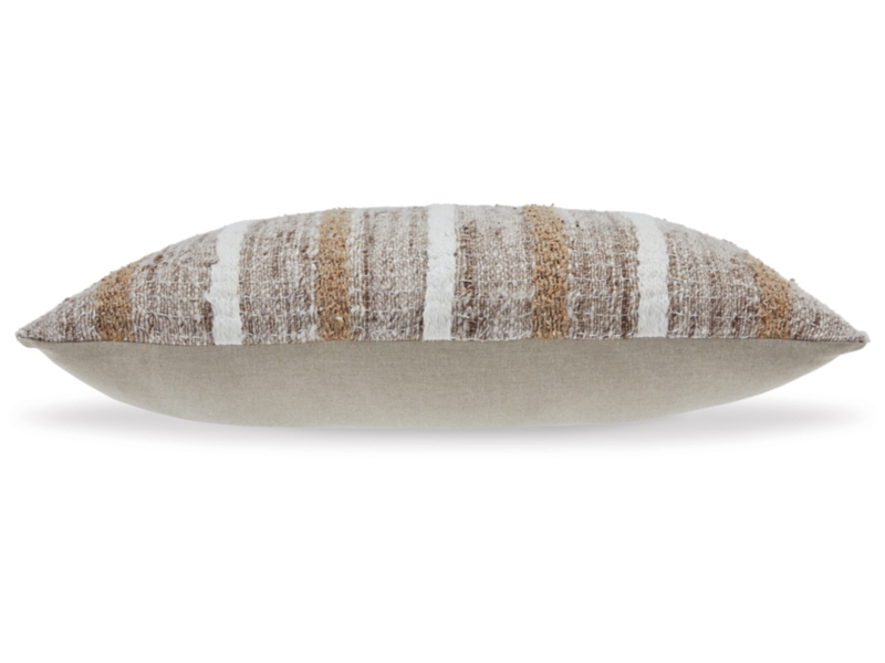 Woven stripe design in shades of tan, brown and white. Solid reverse in ivory. Knife edge construction. Cotton/linen blend face with polyester reverse. Zipper closure. Fiber filled. Spot clean only.