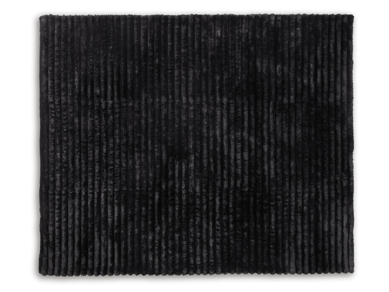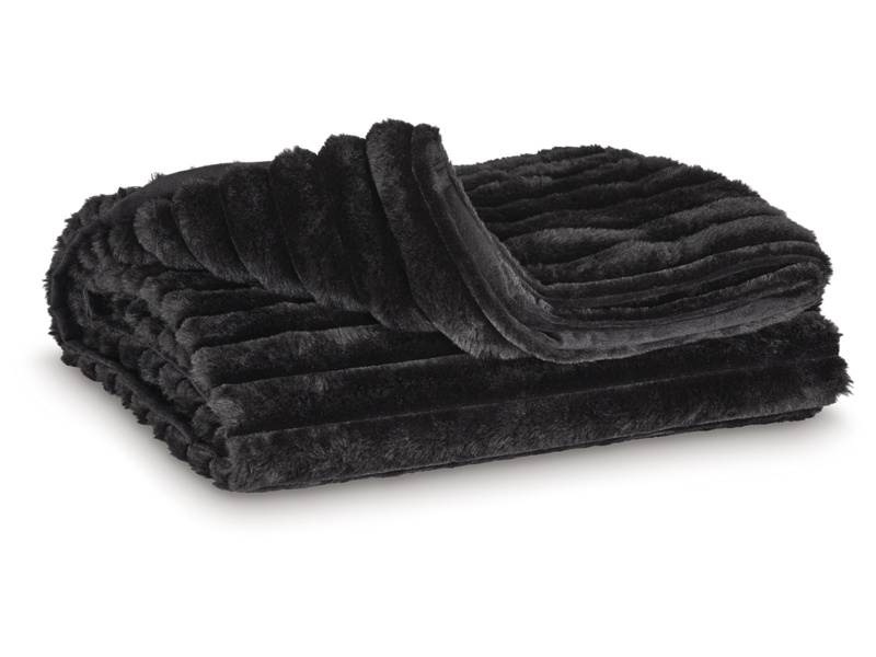 Jacquard faux fur stripe design in black. Solid reverse in black. Polyester. Machine washable, do not tumble dry.