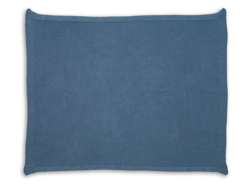 Machine knitted solid in blue. Border edge construction. Cotton. Machine washable.