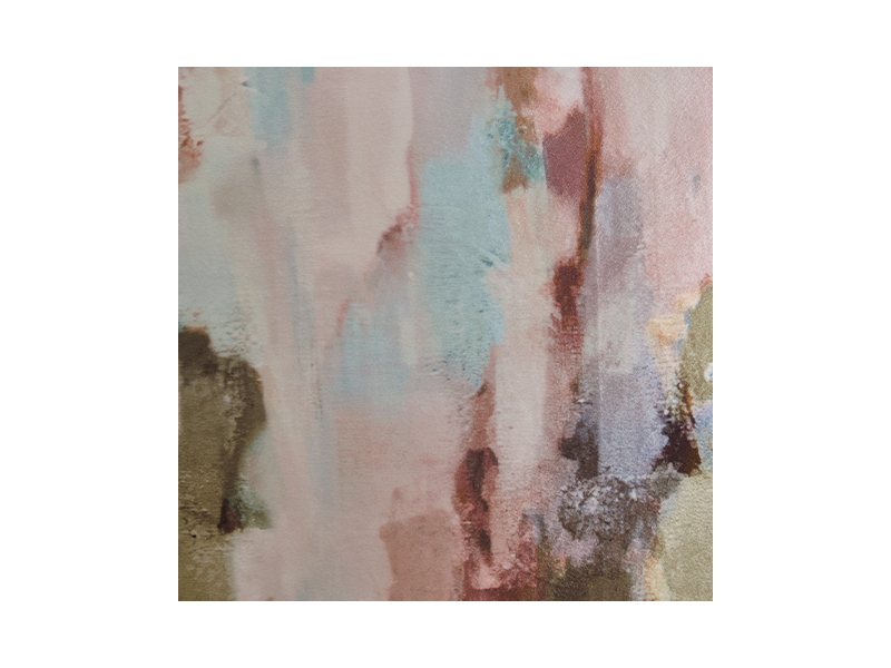 Printed abstract watercolor design in shades of green, pink, teal and cream. Solid reverse in cream. Polyester velvet cover. Zipper closure. Fiber filled. Machine washable cover.