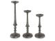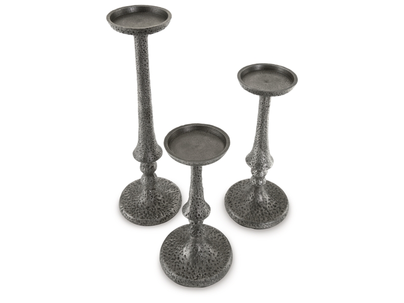 Set of 3 candle holders. Antique pewter finished cast aluminum. Holds (3) 3" pillar candles (candles not included). Due to the finishing process of this product, some variations may occur