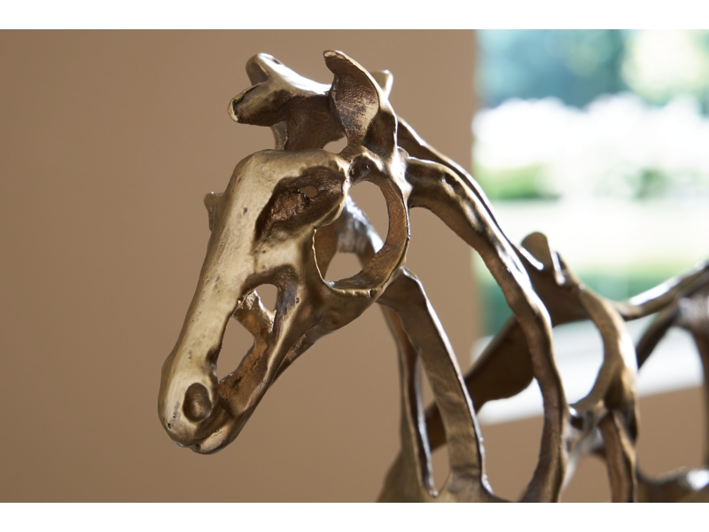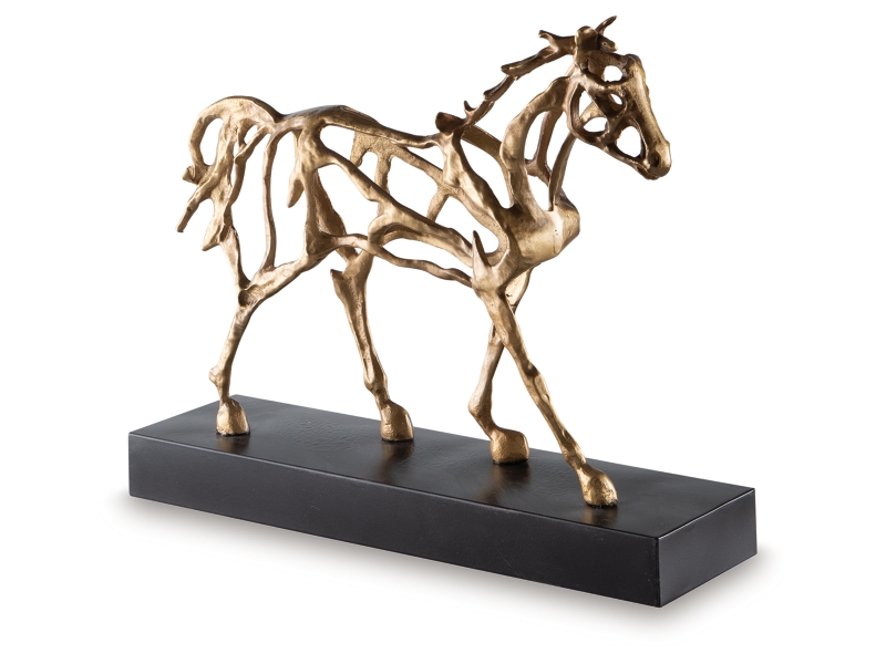 This magnificent equestrian sculpture is a stunning yet casual statement piece in step with your laid-back lifestyle. A cast iron figure in an antiqued goldtone stands atop a contrasting black metal base, making this sculpture a striking conversation starter on any shelf or tabletop.