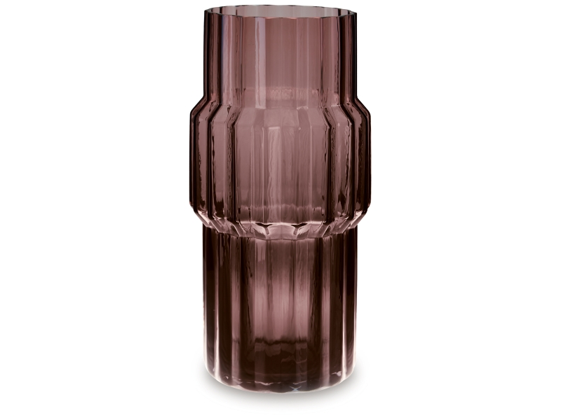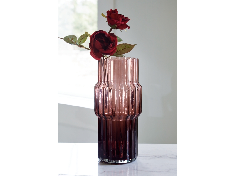This vase, made of dark mauve-tinted glass, adds a captivating touch to indoor or outdoor decor. Its unique textured shape and oversized fluted details create an elegant art piece. Whether it's accentuating flowers or candlelight, this vase is simply striking from every angle.
