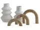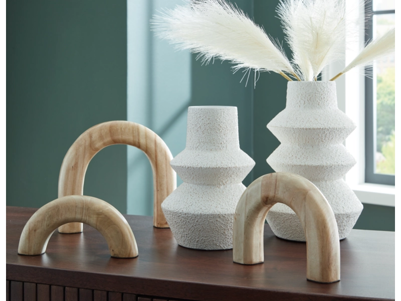 Craft a contemporary haven with the delightfully neutral tones and modern forms of this accessory set. Its sculptures, with their seamlessly streamlined arch designs, can be displayed together or stand solo as subtle statement pieces. The tiered look of the eye-catching vases adds that much more geometric interest.