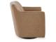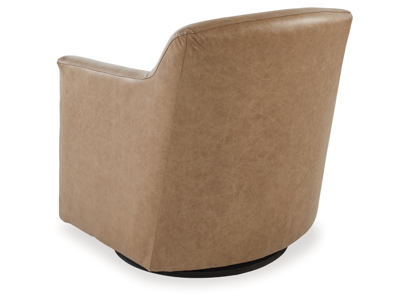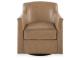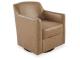 Accent chair. Shelter arm. Leather match upholstery in tumbleweed. Tight back and loose, non-reversible seat cushion. Metal swivel base. Coordinating stationary group 57302.