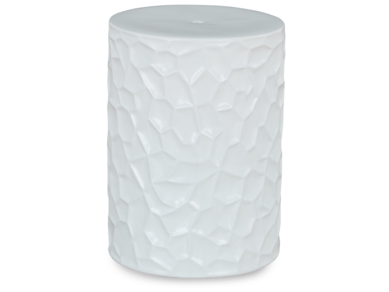Accent stool. Indoor/Outdoor safe. Matte white finished ceramic. Irregular patterned sides.
