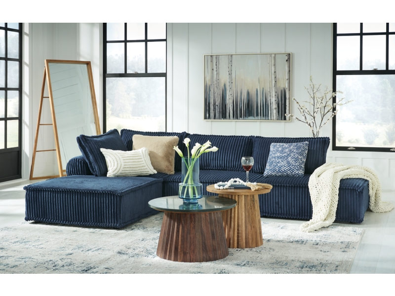 Accent chair. Modular, armless floor seating. Upholstered in a soft, plush navy cord polyester fabric. Double, jumbo welted pillow and bolster with non-slip decking. Non-skid legs.