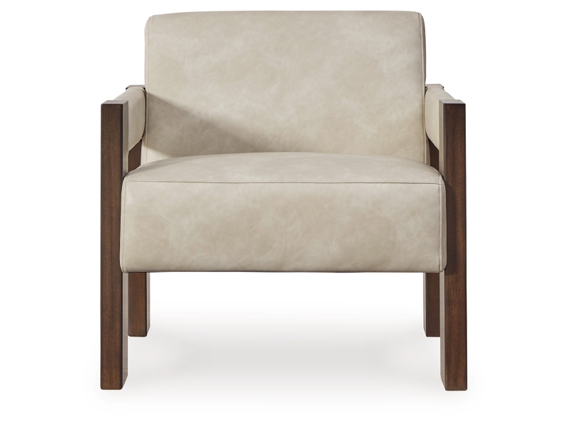 This accent chair is an ultra-contemporary addition to your seating area. Warm espresso-hued wood and neutral faux leather harmonize beautifully for a luxuriously welcoming vibe. Whether you're cozying up with coffee or settling in to stream your favorite show, relaxing has never been so comfortably chic.