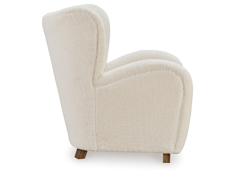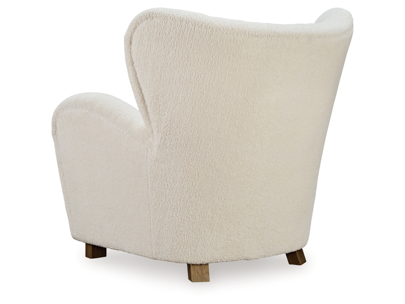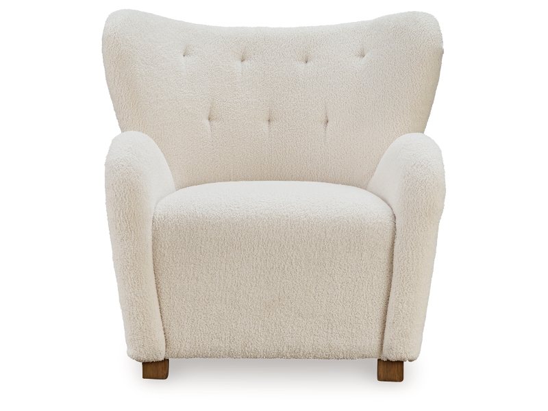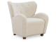 Accent chair. Upholstered in an ecru faux shearling fabric. Tufted wingback with slope arms and tight seat. Wood feet in brown finish.