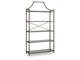 Bookcase. Constructed of metal in antique bronze finish and clear glass. 5 fixed shelves.