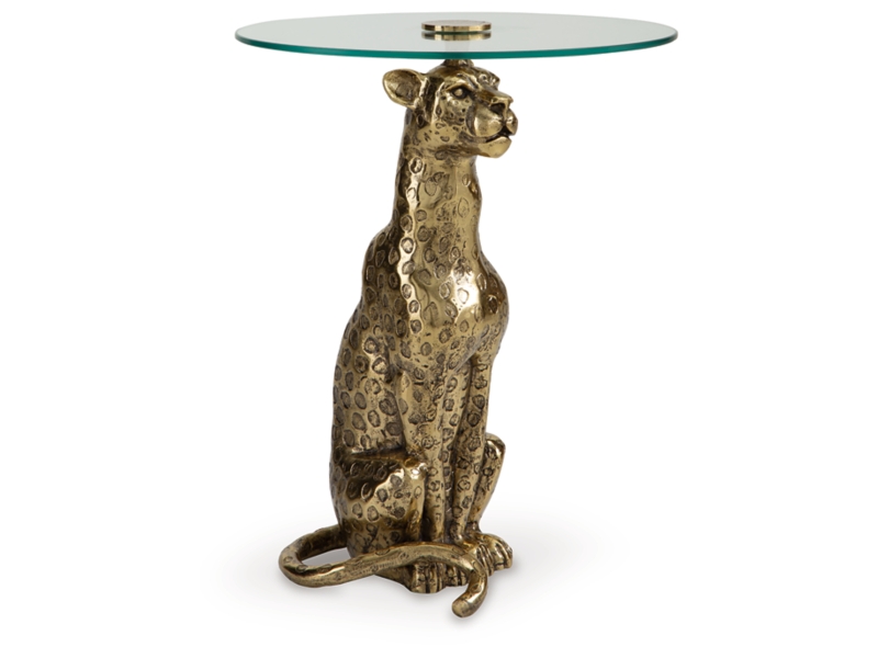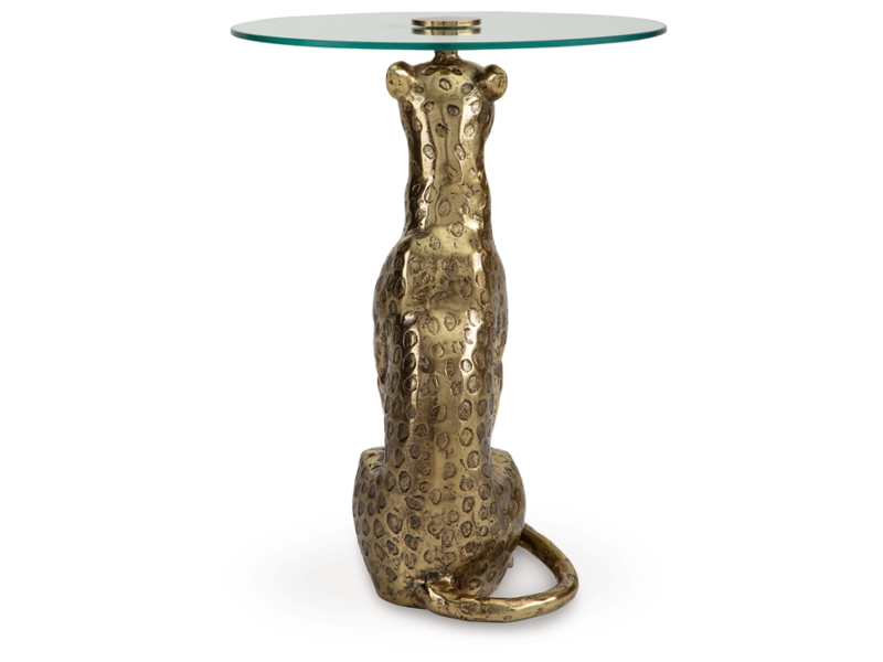 If big and bold is your vibe, you’ll go wild for this accent table. Its leopard base in an antiqued goldtone finish exudes old Hollywood appeal, adding a touch of opulence to everyday living. Radiating an aura of exquisite flair, this showstopping piece fills your home with elaborate elegance.