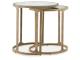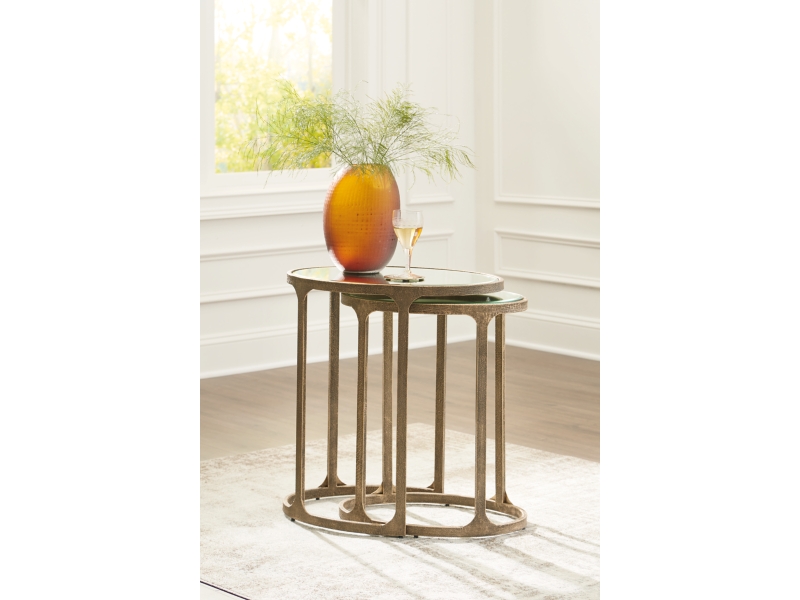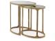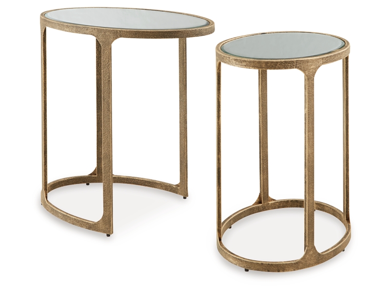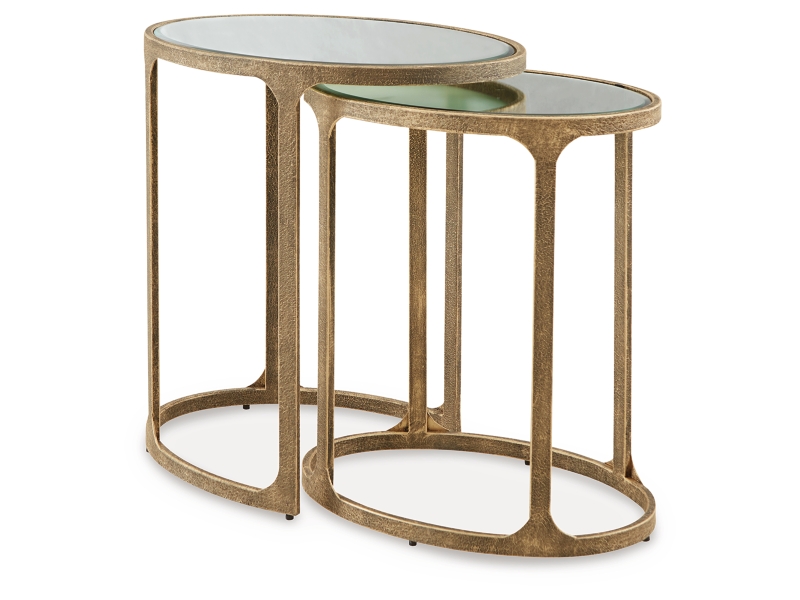 Accent table set. Constructed of metal in textured antique gold finish and beveled mirror. Oval shape. Nesting. Set of 2.