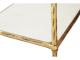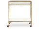 Bar cart. Constructed of sand cast aluminum in antique brass finish, white marble and clear glass. 2 shelves and casters.