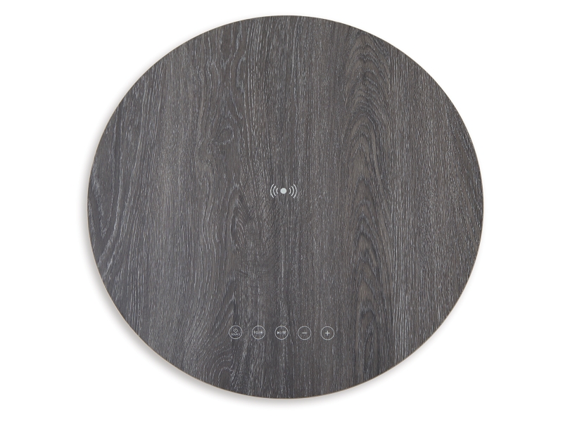 Accent table. Constructed of solid and engineered wood, and metal in black finish and polyester fabric in gray. Decorative laminate over engineered wood top features wireless charging and touch button controls. Additional features include (1) 6.5" full range speaker and (1)2" tweeter speaker, wireless connection, aux in hook up, and(1) USB charging &MP3 port, (1)Type C charging port, Led light under the table, 1 fixed shelf.