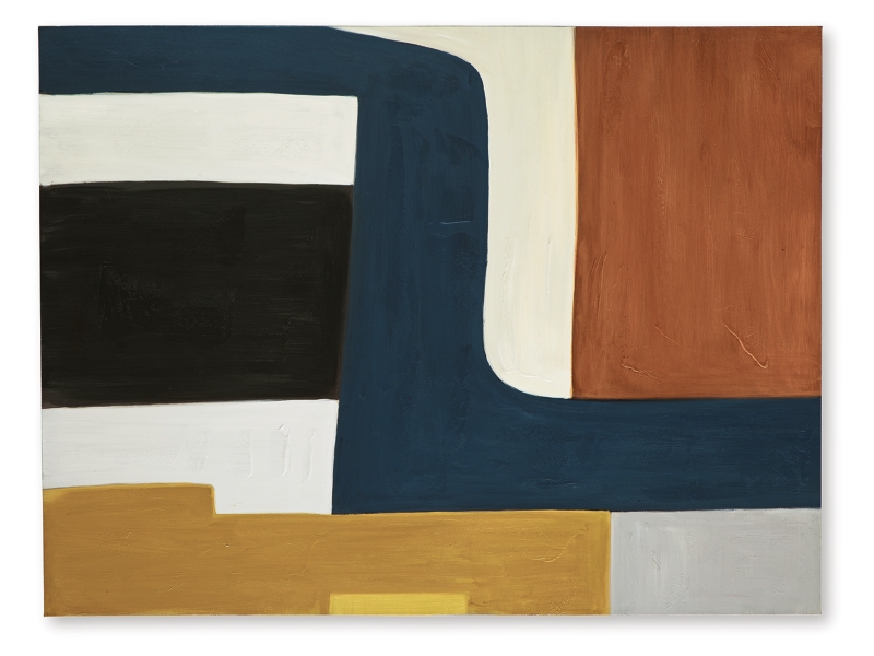 Abstract design in auburn, blue, ochre, brown, cream and gray. Gallery wrapped canvas. Hand painted embellishment. Sawtooth bracket for hanging. Hangs four ways. Due to the hand crafted nature of this product, some variations may occur.