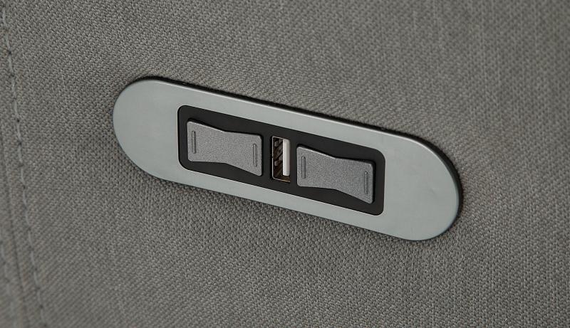 Power recline and power headrests operated by a brushed metal power switch with integrated USB charging