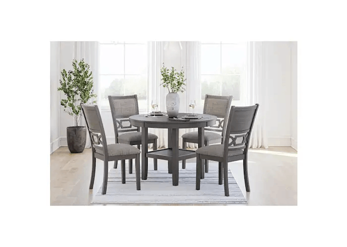 Embrace the beauty of transitional style with the casually sophisticated Langwest dining table and chairs. The clean-lined profile and modern light gray finish merge with textured upholstery to create a timeless yet on-trend look when guests gather. A discreetly placed lower shelf simply makes great storage sense.