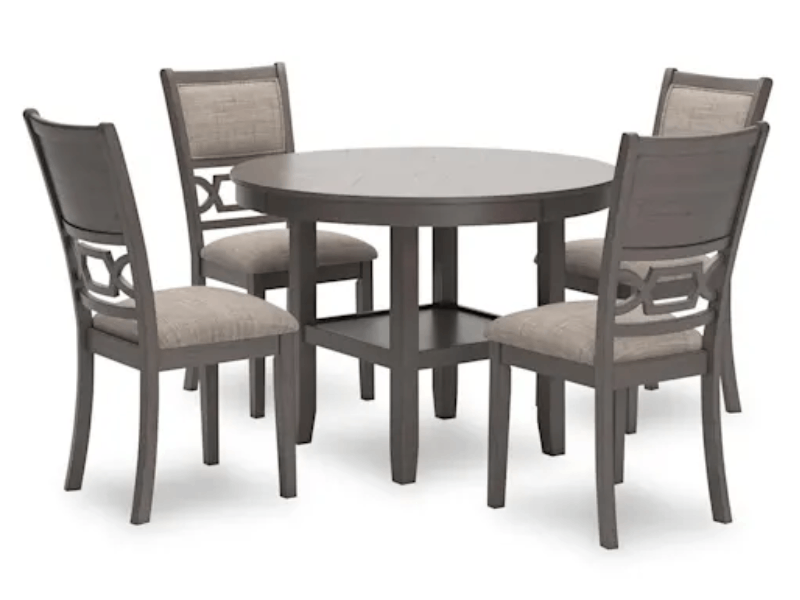 - Includes dining table and 4 upholstered chairs