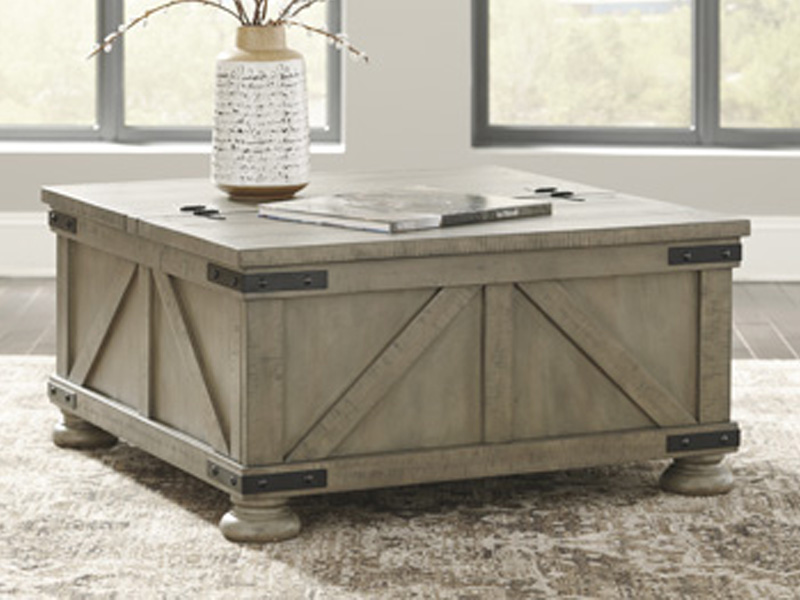Double up on form and function with this square coffee table with storage. Its dual lid tabletop provides easy access to the roomy storage space. Crafted with solid pine wood treated to a weathered gray finish, this generously scaled coffee table is rustic farmhouse living at its best.