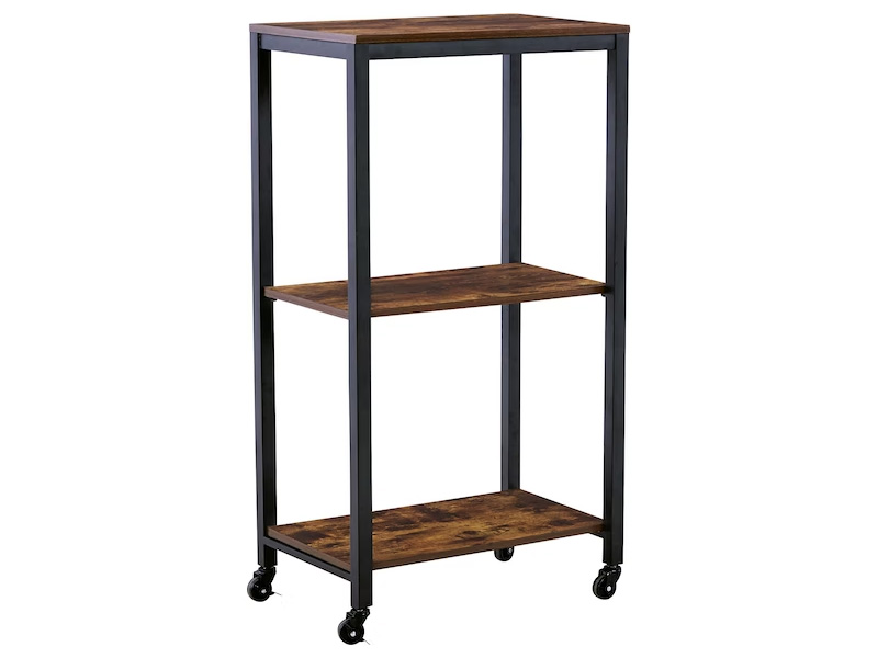 Impress your party guests in style with this bar cart. It features a sturdy design, with black metal rails and an antiqued brown wood finish on the three shelves for a relaxed feel. Smooth-gliding casters offer easy mobility.